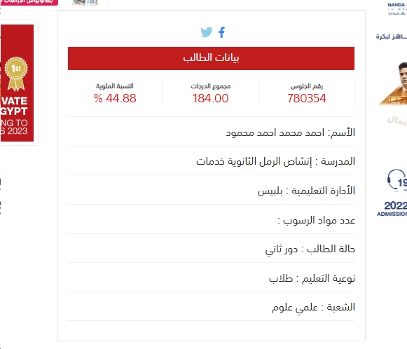 رقم الجلوس 780354 مجموع الدرجات 184.00 النسبة المئوية 44.88 % الأسم: احمد محمد احمد محمود المدرسة : إنشاص الرمل الثانوية خدمات الأدارة التعليمية : بلبيس حالة الطالب : دور ثاني نوعية التعليم : طلاب الشعبة : علمي علوم |