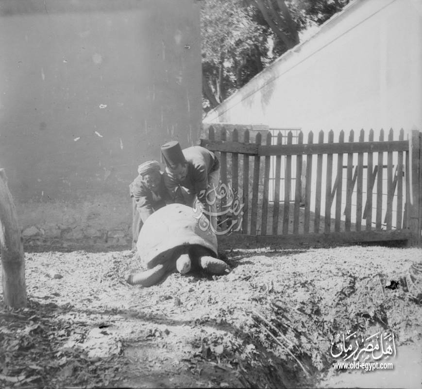 الصورة من حديقة الحيوان بالجيزة سنة 1900 مع السلحفاة المشهورة باسم "سلحفاة الملك فاروق" التي ماتت سنة 2013 عن عمر يتجاوز الثلاثمائة عاما .