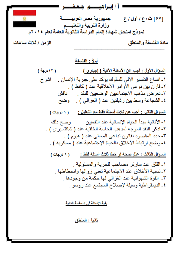 نشر الامتحانات التجريبية للفلسفة والمنطق 2014