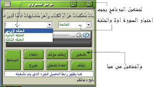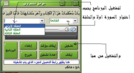 ![]() برنامج تفسير الشعراوى برنامج تفسير الشيخ محمد متولي الشعراوي يجعل الوصول و الإستماع إلى تفسير آية أو سورة معينة من القرآن أكثر سهولة. البرنامج مُعّد لتشغيل جميع حلقات برنامج خواطر الشيخ محمد متولي الشعراوي المُتاحة حالياً. يمكن للبرنامج أن يعمل بدون تحميل للملفات الصوتية على القرص الصلب لجهازك و لكن يجب في هذه الحالة أن تكون متصلا بشبكة الانترنت. كذلك يمكن تشغيل البرنامج دون الحاجة للإتصال بالشبكة و لكن يجب تنزيل الملفات الصوتية و حفظها على القرص الصلب. لتشغيل البرنامج، قم بتحميله من رابط التحميل أدناه و إنشاء مجلد “folder” جديد ثم قم بفك ملف البرنامج المضغوط داخل المجلد ثم قم بتشغيل البرنامج sharawy و تتبُع إرشادات الإستخدام التي يمكن التحميل http://www.megaupload.com/?d=HEMQP00O |