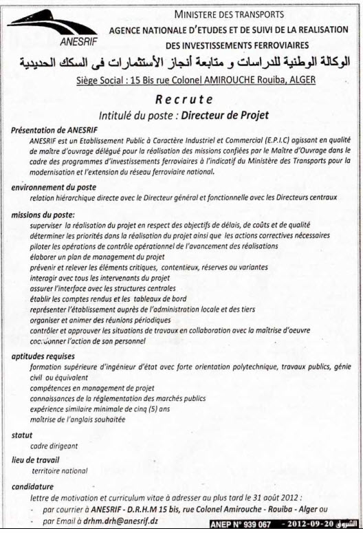 توظيف بالوكالة الوطنية للاستثمارات في السكك الحديدية 2012