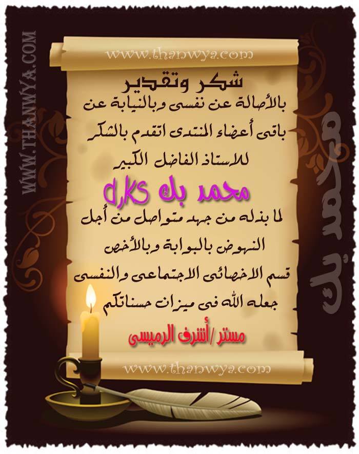 الأستاذ / محمد بك وعلي نفس الدرجة من إنسانية تقدر كل مجهود مبذول .. قام بالإهتمام بموضوع .. لايقدم عليه سوي من وهبه المولي عز وجل .. مشاعر فياضة من إنسانية .. كرمنا المولي بها عز وجل .. وهو علي نفس درجة الإحترام والتقدير وله أيضا جزيل شكرنا في تصميمه للوحة الشكر والتقدير .. بل وإيثار آخر علي نفسه .. ألا وهو الأستاذ/ محمد محمود بدر ووقع إهدائها بإسم قد لايكون له أي فضل في هذا الموضوع .. وهو أقل الجميع شأنا شكرا أستاذنا الكريم .. المحترم
