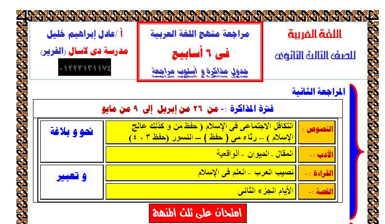 كل أسبوعين 3 امتحانات على ثلث المنهج ، الامتحانات بصيغة pdf و word أدعو الله أن تكون فى ميزان حسناتنا جميعا |