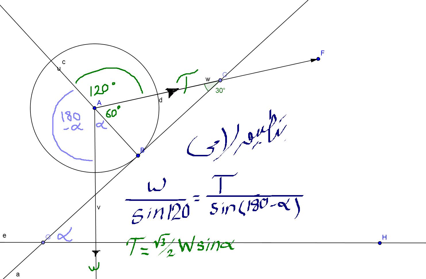 أنـآ ع ـندي مســــــــــــآآلتين ع إلقوى إلمستوية ح ــلهم موج ــود ع ـندي بس ح ـآولت أطلع ع ــليهآ مش ج ـآآية مع ـــــآآيآ وأشكـ إنهـآ غ ــلط لآنهـآ مح ــلولة فى ورق لإوستـآذ قديم شووية وبطريقة ع ـبيطة شوية ع ــلق إلخيط ABCD من إلنقطتين A.B . ثبت إلوزنـآن 12 ثقل جرام عند B , وإلوزن W ع ـند C بحيث يميل AB على إلآفقي بزآوية 60 ، CD علي إلآفقي بزآوية 30 بينمـآ كـآن BC أفقياً أوج ــــــــد W أنـآ وقفت لغ ــآآية W= جذر 3 * BA ســآلب 12 وضع ــت كرة وزنها W على مستوى أملس يميل ع إلآفقي بزآوية alfa بوآسطة خ ـيط طوله = نصف قُطـرـر إلكرة مربوط طرف منه فى سطح إلكرة وإلطرف إلآخ ــر فى نقطه ع إلمستوي أثبت أن إلشد فى إلخ ــيط = 2/3جذر3 W * sin alfa إلشـد طلع مع ـــــــــــآيآ أنـآ 6/جذر 12 W