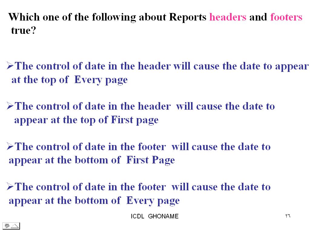 اما اذا كان فى report header- footer يظهر فى الصفحة الاولى فقط انا مدرب icdl ومتاكد من الاجابات |