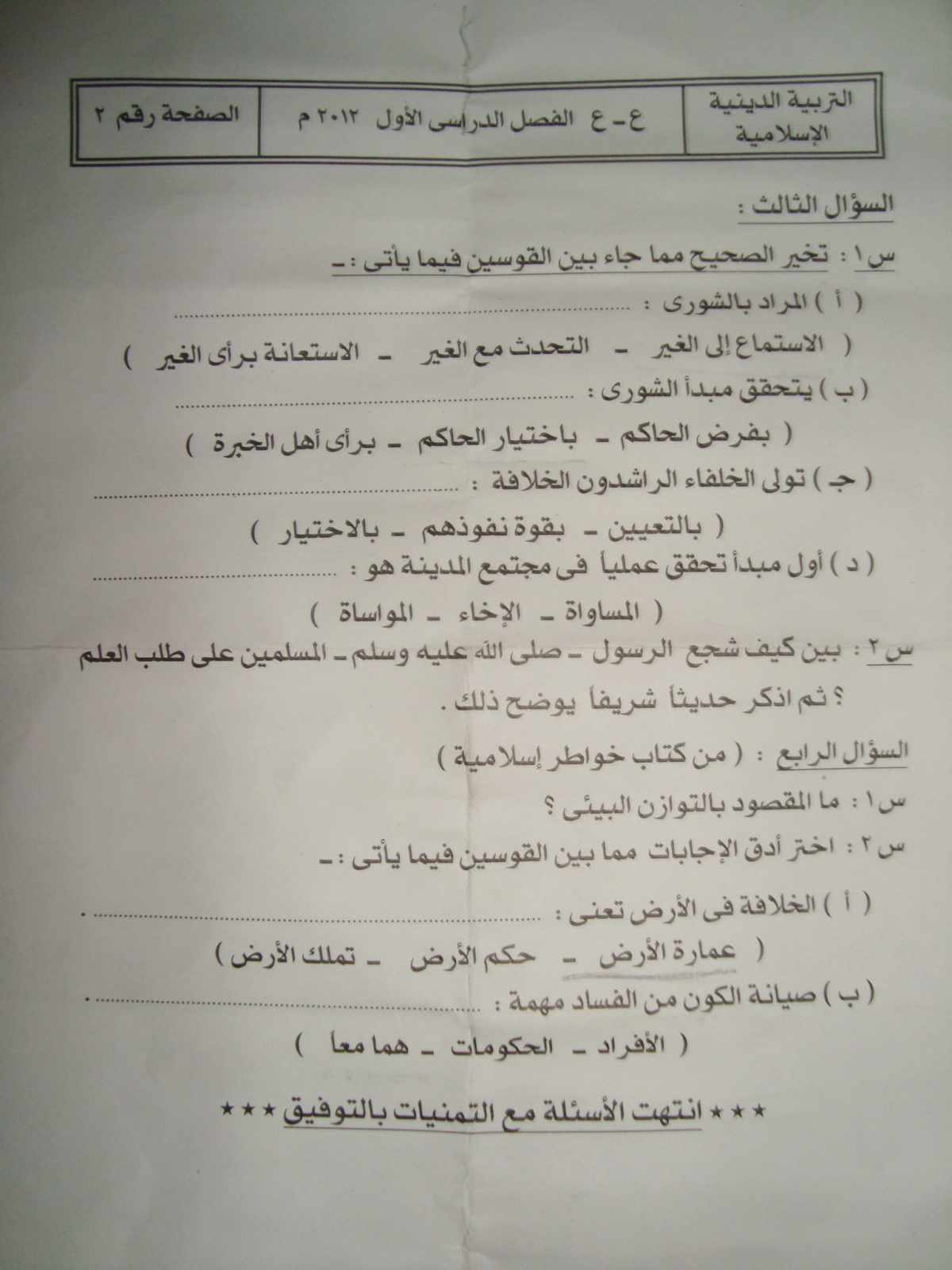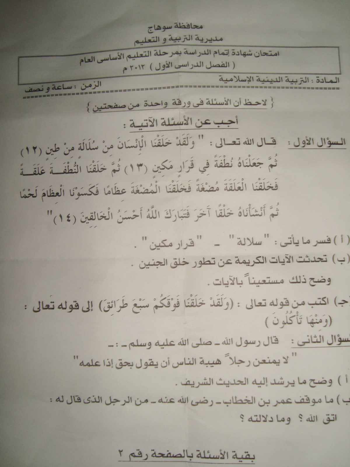 امتحان دين محافظة سوهاج ترم اول بتاريخ 23-1-2012 اللهم وفق الطلبة والطالبات جميعا سبحان الله وبحمد سبحان الله العظيم