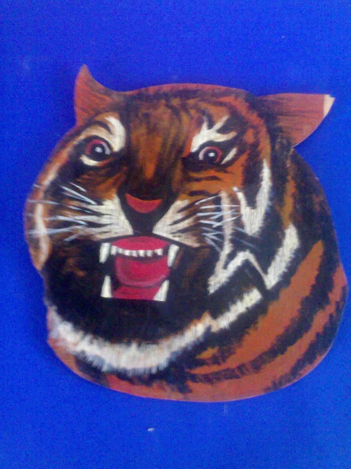 هذه قاعدة كرسى خشب مكسورة ومهملة حولتها إلى وجه نمر بواسطة منشار آركيت ولونتها بألوان زيتية فأصبحت لوحة فنية جميلة