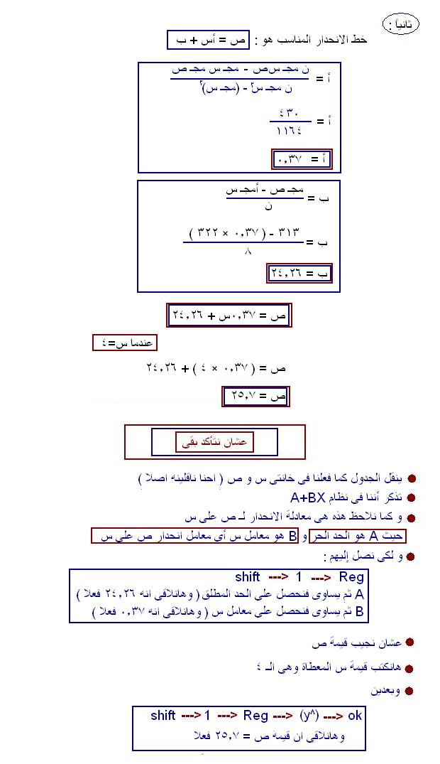 عشان نجيب قيمة ص هانكتب قيمة س المعطاة وبعدين shift --> 1 --> Reg --> (y^) = ok لاننا عايزين قيمة الـ ص اللى هى الـ y --- وعشان نجيب قيمة س هانكتب قيمة ص المعطاة وبعدين shift --> 1 --> Reg --> (x^) = ok لاننا عايزين قيمة الـ س اللى هى الـ x جربتها على مسألة دلوقتى ومتأكدة اقتباس:
