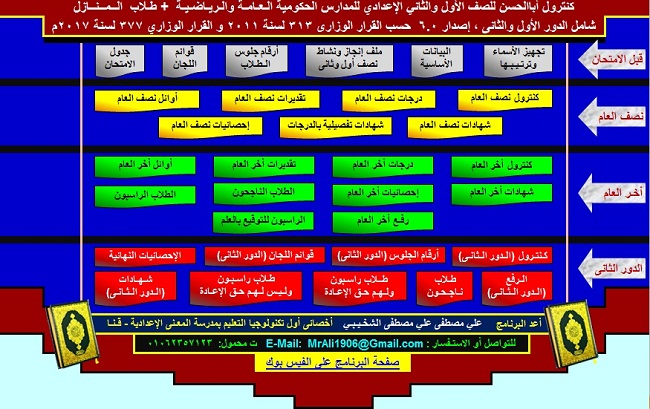 الإخوة الأفاضل تم بفضل الله تعالى الانتهاء من عمل برنامج كنترول شيت أباالحسن خاص بالصف الأول والثاني الإعدادى للمدارس الحكومية العامة والرياضية. 1- ترتيب الاسماء أبجديا أو حسب الفصل أو النوع. بعد نسخها من خارج البرنامج ولصقها بالبرنامج (أو كتابتها). والبرنامج يقوم بعمل الاتي: 2- عمل أرقام جلوس للطلاب. 3- عمل قوائم لجان. 4- عمل جدول الامتحانات ، ويمكن طبعه على ظهر رقم الجلوس. 5- عمل كشوف خاص بدرجات وتقديرات نصف العام وأخري خاصة بدرجات وتقديرات أخر العام. 6- إحصائيات خاصة بنصف العام و أخر العام والدور الثاني ، وتشمل احصائيات الجودة و 65% من الامتحان التحريري. 7- الطلاب الأوائل في كل مادة والطلاب الأوائل لكل فصل ، في نصف العام وأخر لعام. 8- شهادات لنصف العام وأخري خاصة بأخر العام والدور الثاني أيضا (ويتم طباعتها بالترتيب فتطبع الشهادات الخاصة بالناجحين ثم الشهادات الخاصة بالراسبيـن). 9- كنترول أخر العام الكبير (ويشمل نصف واخر العام) ويمكن طباعته على ورق حجم كبير (60×90 سم ). ، ويمكن فلترة الطلاب الناجحين على حدة ، والطلاب الراسبين على حده. 10- في أخر العام يقوم البرنامج بعمل كشوف خاصة بالطلاب الناجحين وأخري خاصة بالطلاب الراسبين. 11- كشوف خاصة بتوقيع الطلاب الراسبين بالعلم على مواد رسوبهم. 12- ورقة خاصة برفع في اخر العام وأخري خاصة بالدور الثاني ، ويتم تحديد الطلاب المستحقين للرفع ، والمواد التي سيتم رفعهم فيها ، والدرجات المطلوبة للنجاح. 13- في الدور الثاني يتم الرصد في صف فارغ فوق درجات الطلاب الخاصة بالدور الأول. 14- بعد انتهاء رصد درجات الدور الثاني ، يعطى البرنامج 3 كشوف متنوعة كما يلي a. كشوف الطلاب الناجحين. b. كشوف الطلاب الراسبين والباقين للإعادة. c. كشوف الطلاب الراسبين والمحولين للمدارس المهنية . 15- جميع الصفحات متاحة للطباعة ، كما يمكن تصدير ها ملف PDF ، وسيقوم البرنامج بإنشاء ثلاث مجلدات لوضع ملفات الـ PDF الناتجة بشكل منظم كما يلي: a. مجلد خاص بجميع اعمال نصف العام. b. مجلد خاص بجميع اعمال أخر العام . c. مجلد خاص بجميع اعمال الدور الثاني. 16- البرنامج له كلمة مرور ، ويمكنك تغييرها أو مسحها. 17- متطلبات تشغيل البرامج :يعمل على أوفيس 2010 فما احدث. رابط تحميل البرنامج http://bit.ly/2yiDaJd الرجاء الاطلاع على ملف الشرح وهو عبارة عن ملف PDF شرح بالصور لاستخدام البرنامج. ------------------------- مصمم البرنامج : أباالحسن علي مصطفى علي مصطفى الشخيـبـي أخصائي تكنولوجيا تعليم أول مدرسة المعنى الاعدادية بقـنـا آخر تعديل بواسطة محمد محمود بدر ، 28-12-2017 الساعة 12:31 PM |