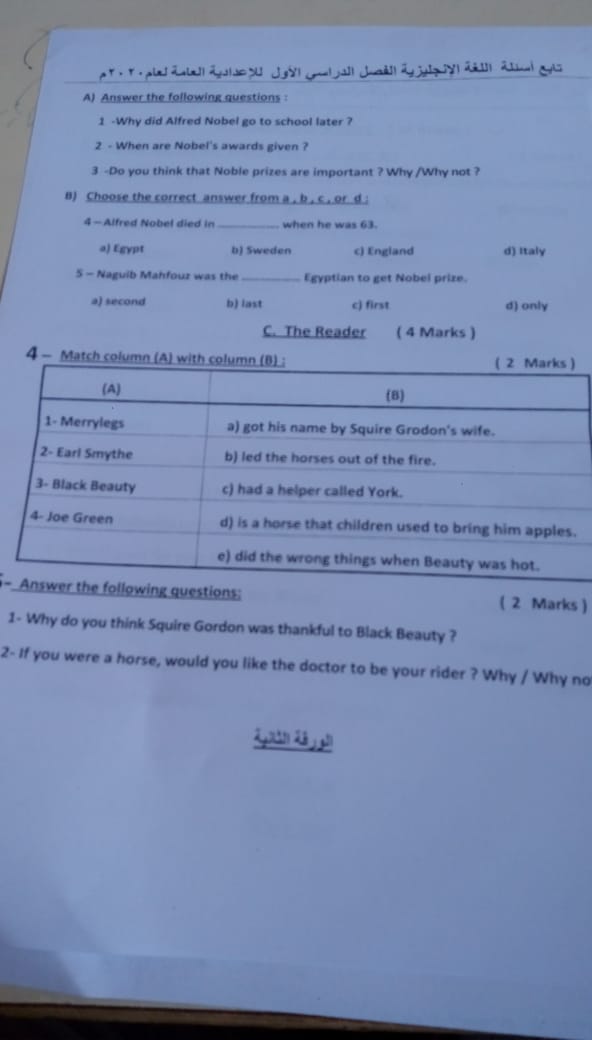 امتحان الشهادة الاعدادية الترم الاول محافظة القليوبية ٢٠٢٠