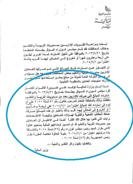 اعلنت وزارة المالية رفضها لطلب بعض مديريات التربية والتعليم بالمحافظات بعدم رد المبالغ التي صرفت للإداريين بعدد من مديريات التربية والتعليم بالمحافظات،