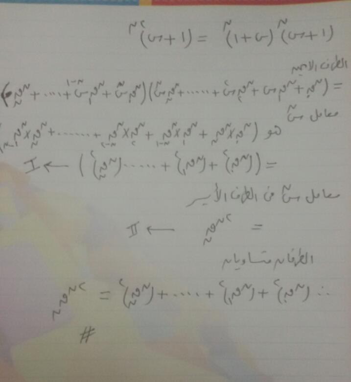 فى مفكوك (١+س) اس ن =ن ق ٠ +ن ق ١ س +ن ق ٢ س٢+...... بتفاضل الطرفين بالنسبة ل س ثم بالتعويض عن س =١ فى الطرفين ينتج المطلوب
