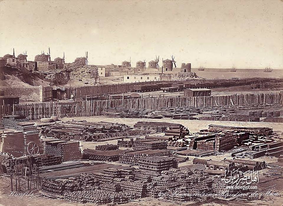 طواحين الهواء في منطقة المكس - الاسكندرية سنة 1870 م - و تظهر بالصورة ورشة و محطة قطار المكس .