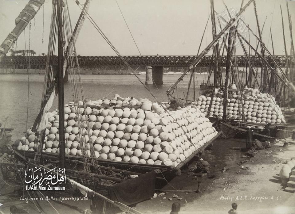 مئات المنتجات الفخارية المصنوعة يدوياً مشحونة في مراكب شراعية لنقلها عبر نهر النيل حيث نجدها في الصورة تقف خلف كوبري قصر النيل في القاهرة لانتظار ميعاد فتح الكوبري لتكمل السير الي وجهتها .