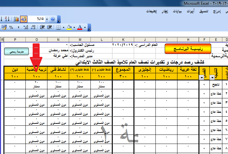 بالنسبة للصف الثالث مادة التربية الرياضية كشف رصد تقديرات ودراجات نصف العام تكون الدرجة من 20 وليس من 100
