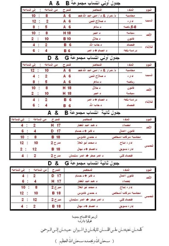 السلام عليكم ورحمة الله وبركاتة مرفق جدول سنة اولي وسنة ثانية