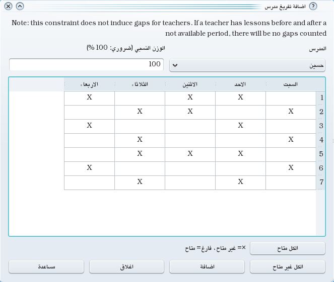لدي مدرس كبير في السن ومريض ، ويصعب عليه الوقوف لفترة طويلة واريد أن اجعل اقصى حصص متصلة له (٢) ، بمعنى أن جدوله ﻻ يمكن أن يحتوي على ثلاث حصص متصلة ، وانما يكون هناك حصة فارغة بعد كل حصتين ؟