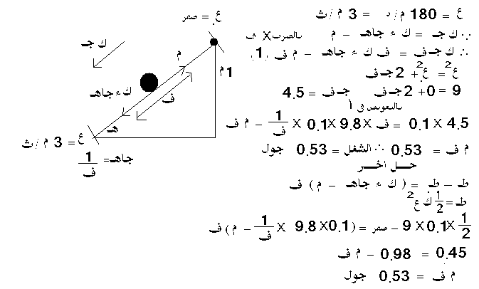 (2) وضع جسم عند قمة مستوى مائل خشن ارتفاعه متر فانزلق ووصل الى قاعدة المستوى بسرعة 180م/د فإذا كانت كتلته 100جم فاحسب الشغل المبذول ضد الاحتكاك