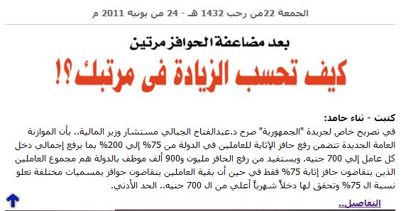 حضرتك تعلم أنه تم الاعلان عن الحد الادنى للاجور يوم الاربعاء 01/06/2011
