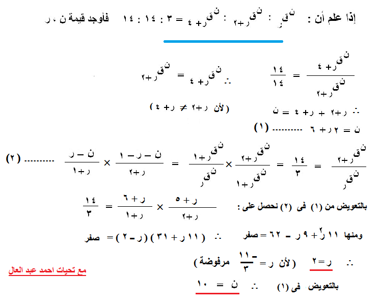 من تساوى الثانية والثالثة (14: 14 ) اما ر +2 = ر+4 وهذا غير ممكن أو أن ن = 2 ر + 6 ومن النسبة الاولى والثانية بعد الفك والاختصار ستجد أن 3(ن - ر) ( ن-ر - 1 ) =14 (ر + 2) ( ر+1) وبالتعويض عن ن بدلالة ر تجد أن