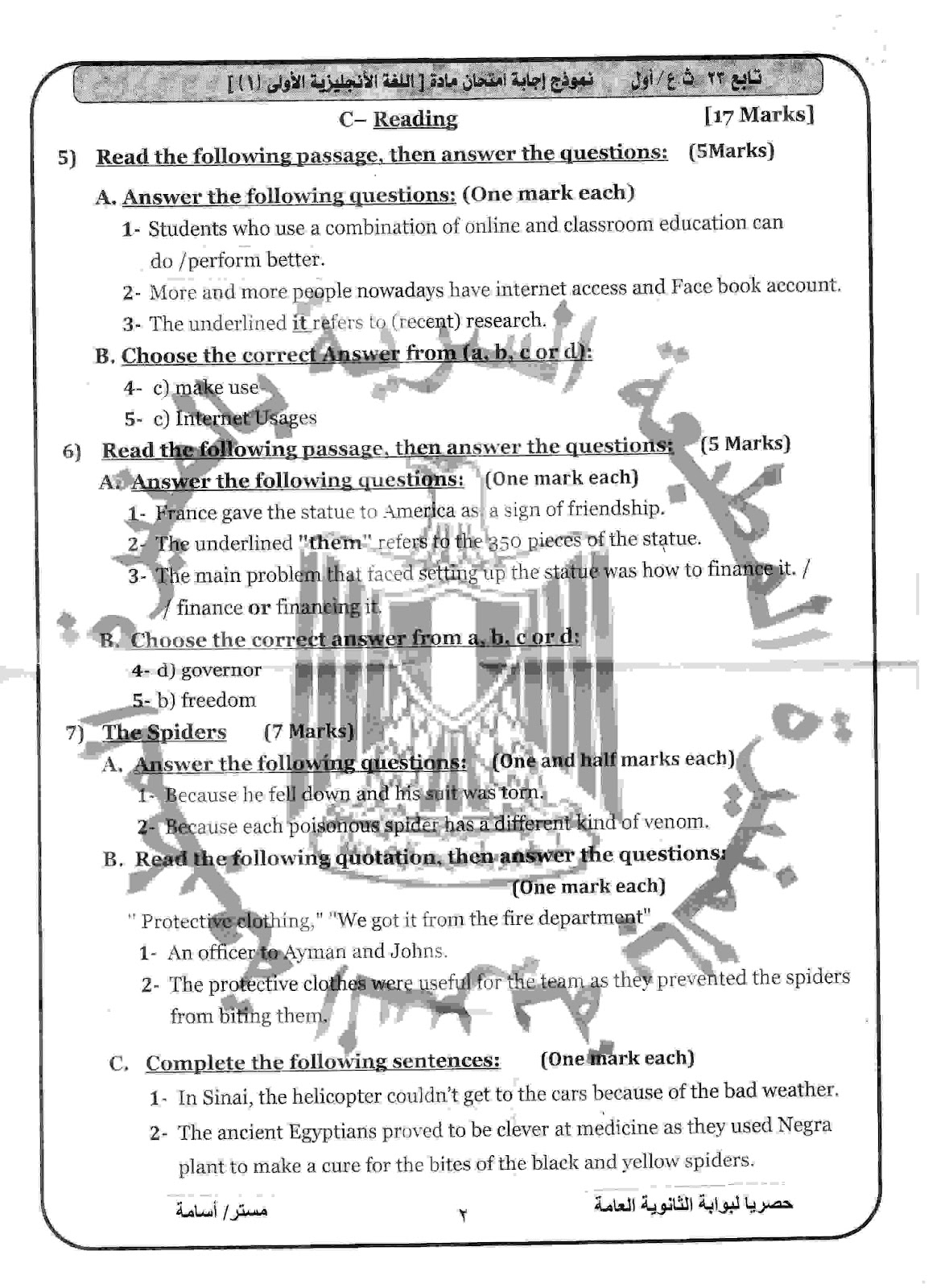نموذج اجابة امتحان اللغة الانجليزية ثانية ثانوى 2012 الرسمى