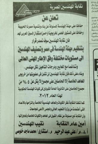 اعلان في جريدة الجمهورية لنقابة المهندسين يعلن عن عدم قيد المقبولين في المعاهد والجامعات الخاصة للحاصلين على اقل من 5% عن مجموع الحاصلين على الثانوية العامه والمقبولين بكليات الهندسة الحكومية