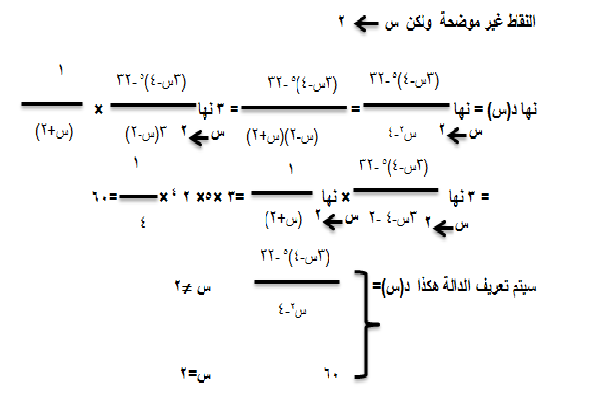 والنقطة الثانية هي .. (س = 2) .. ونهاية الدالة عند هذه النقطة موجودة وقيمتها (60) ... لذلك يمكن إعادة تعريف الدالة بالقاعدتين التاليتين: