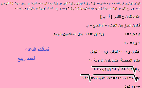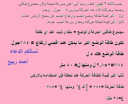 2- قوتان تؤثران فى نقطة مادية مقدارهما ق1 , ق2 نيوتن , ق2 اكبر من ق1 ومقدار محصلتهما ح نيوتن حيث (4 اقل من اوتساوى ح اقل من اوتساوى16) اوجد قيمة كل من ق1 , ق2 ومقدار ح عندما يكون قياس الزاوية بينهما 60 3- جسم كتلته 2 كجم , قذف راسيا الى اعلى بسرعة معينة وكان مجموع طاقتى وضعه وحركته اثناء هذه الحركة يساوى 784 جول . اوجد : اولا : اكبر قيمة لطاقة وضع الجسم وارتفاع الجسم عن سطح الارض عندئذ . ثانيا: اكبر قيمة لطاقة حركته ومقدار سرعة الجسم عندها . |