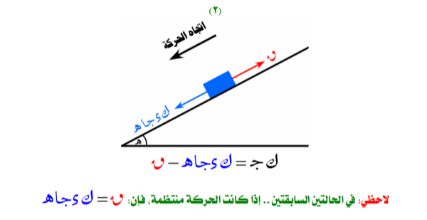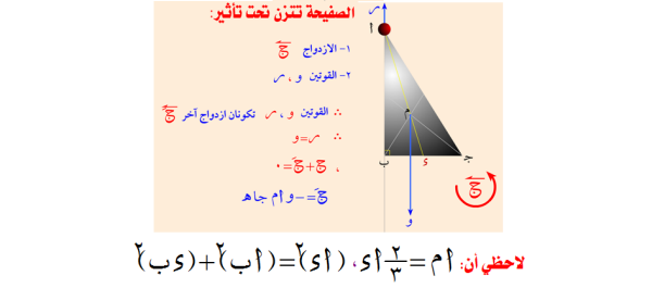 يمكن تعيين معادلة خط عمل المحصلة باستخدام متجه عزمها عند أي نقطة على خط عملها على النحو التالي ... وجدنا أن متجه المحصلة = (5 ، -10)، والمحصلة تمر بالنقطة أ(1 ، 4) ... لذلك نفرض النقطة جـ(س ، ص) تقع على خط عمل المحصلة .. وطبعًا سوف ينعدم متجه عزم المحصلة عند النقطة جـ .. مما يعني أن: المتجه جـ أ × (5، -10) = المتجه الصفري إذن (1 - س ، 4 - ص) × (5 ، -10) = المتجه الصفري .. ومنها ينتج أن معادلة خط عمل المحصلة هي .. 2س + ص - 6 = 0 ويمكن استخدام هذه الفكرة لتعيين معادلة خط عمل اي قوة ..  |