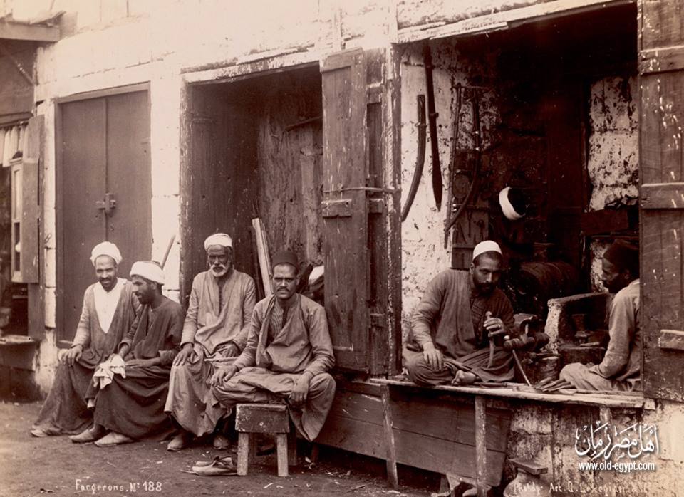 ورشة حدادة لصناعة السيوف و الخناجر في شارع سوق السلاح بالقاهرة حوالي عام 1886 .
