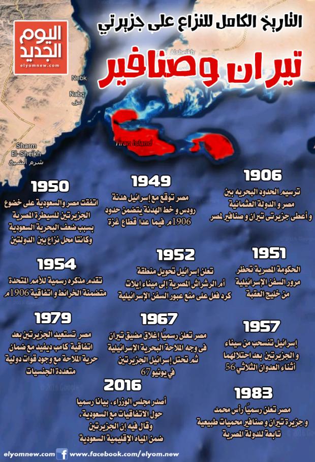 في كتابه "قناة السويس ومشكلاتها المعاصرة" (مكتبة النهضة المصرية، القاهرة 1956)، يشير الدكتور مصطفى الحفناوي أحد أبطال تأميم قناة السويس، إلى جزيرتي تيران وصنافير بقوله (صـ 462) "أما عن الجزيرتين اللتين احتلتهما مصر في خليج العقبة فهما جزيرتان مصريتان سبق أن احتلتهما القوات المصرية عام 1906 أثناء وضع الحدود بين مصر والبلاد العثمانية، فلم يكن في ذلك الاحتلال مفاجأة. ومنذ أن انتهت العلاقة بين مصر والدولة العثمانية ظلت الجزيرتين مصريتين". ولم تكن المملكة العربية السعودية قد تأسست أصلا في ذلك الحين إذ أنها أصبحت دولة عام 1932.