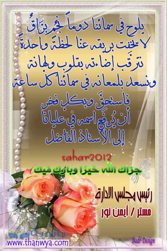 ... يلوح في سمائنا دوماً نجمٌ برَّاقٌ لا يخفت بريقه عنَّا لحظةً واحدةً ... نترقَّب إضاءته بقلوب ولهانة ...ونسعد بلمعانه في سمائنا كلّ ساعة ...فاستحقَّ وبكلِّ فخر أن يُرفَع اسمه في عليانا ... إلى الأستاذة الفاضلة/ أم علاء ![]() إلى الأستاذة الفاضلة/ Sahar2012 ![]() إلى الأستاذة الفاضلة/ aleman ![]() إلى الأستاذة الفاضلة/ دقـــــــة قــلــــــبــــ ![]() إلى الأستاذة الفاضلة/ مـادوكـــا ![]() ... جزاكُنَّ اللهُ خيرًا وبارك فيكُنَّ ...