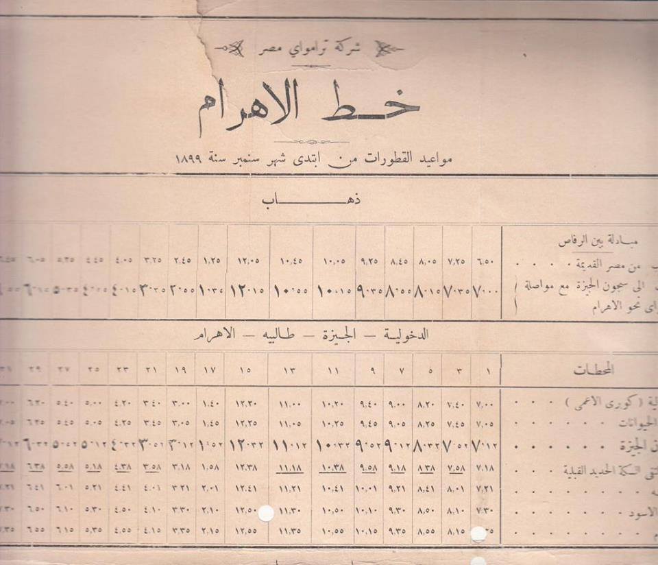 ![]() تعلن شركة ترامواي مصر عن انتهاء العمل في خط الترام الجديد بشارع الهرم بالجيزة و ستبدأ أولي الرحلات عند السابعة الا عشر دقائق صباحا و تستمر حتي السابعة و النصف مساء بمعدل رحلة واحدة كل نصف ساعة في أربع محطات رئيسية هي - الدخولية -الجيزة -الطالبية -الاهرام و هذا هو جدول مواعيد الرحلات .... القاهرة - سبتمبر سنة 1899 ![]()