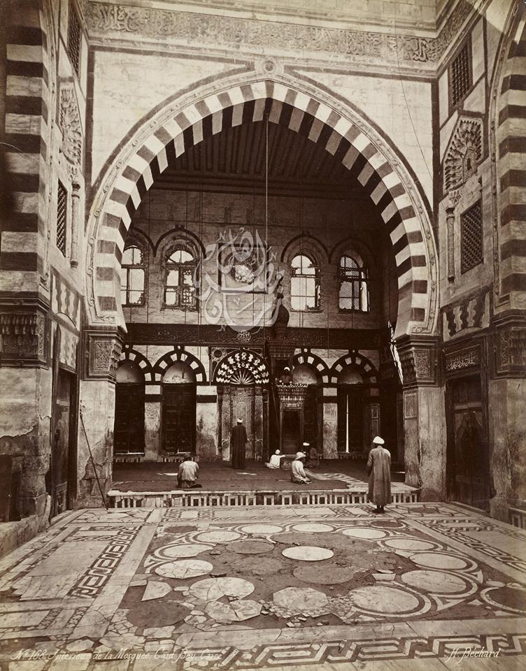 ![]() من داخل مسجد قايتباي - القاهرة سبعينات القرن التاسع عشر حوالي عام 1875 م منشئ هذا المسجد هو السلطان الأشرف قايتباى بين عامي 1472-1474 م اي ما يقرب من 541 سنة قدم إلى مصر في رفاقة تاجره محمود بن رستم سنة 1435/ 36م فاشتراه الملك الأشرف برسباى واستمر ضمن مماليكه إلى أن اشتراه السلطان الظاهر أبو سعيد جقمق وظل في رقه حتى أعتقه. ومن ثم تقلب في عدة وظائف إلى أن ولى السلطنة عام 1468م، وكانت مدة حكمه تسعا وعشرين سنة وبضعة شهور حيث توفى عام 1496م . وقد ازدهرت العمارة الإسلامية في عهده ازدهارا عظيما وكثرت منشآته وتنوعت وامتازت بتناسب أجزائها ووفرة زخارفها ونقوشها وبلوغها من الدقة والإتقان شأنا عظيما، وبينما نراه اهتم بالأبنية الحربية فأنشأ طابية قايتباى بالإسكندية وطابية رشيد، نراه اهتم بإقامة المنشآت المدنية والخيرية فأنشأ المنازل والوكالات والأسبلة وأحواض سقى الدواب وله الكثير منها بالقاهرة، كما اهتم بترميم وتجديد كثير من منشآت أسلافه. هذا ولم يكن اهتمامه بإنشاء المساجد بأقل من اهتمامه بغيرها فله في القاهرة ثلاث مساجد شهيرة مسجده بالروضة ومسجده بقلعة الكبش وهذا المسجد الملحق به تربته والذي شيده بقرافة المماليك التي يطلق عليها قرافة قايتباى لكثرة منشآته بها. نلاحظ ان صورة مسجد قايتباي مطبوعا علي الجنية الورقي . ![]()