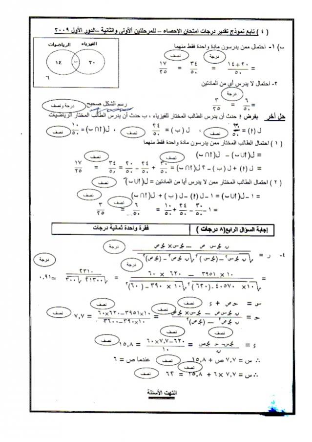 ده نموذج الاجابة الرسمي لامتحان الاحصاء 2009