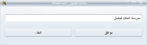 اضافة اسم المدرسة: ١- نختار بيانات ٢- ننقر على زر "اساسي" ومنها نختار (معلومات المنشأة) ثم اسم المنشأة . ونكتب اسم مدرستنا كما في الصورة. ٣- ننقر على زر "اساسي" ومنها نختار (معلومات المنشأة) ثم "شرح" ونكتب في اسم مدير المدرسة أو اسم المدرس الذي صنع الجدول، بالنسبة لي اضع اسم مدير المدرسة .