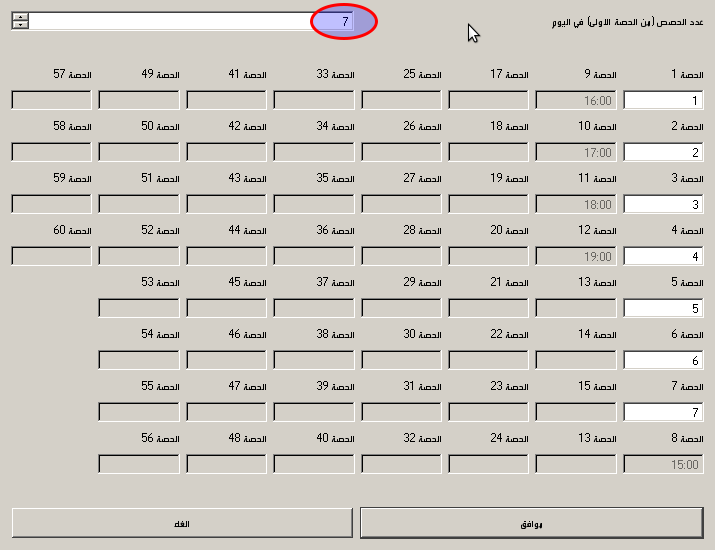 ١- من لوحة التحكم الرئيسية نختار البيانات ثم اساسي ثم الايام والساعات ثم الايام في الاسبوع كما في الصورة : ونجعل ايام العمل الاسبوعي ٥ ثم نسمي الايام بالاسم الذي نريد ، بالنسبة لي اختصرت السبت إلى (س) والاحد إلى (ح) وهكذا بالنسبة لبقية ايام الاسبوع، مع ملاحظة أن ايام العمل الاسبوعي تختلف من دولة إلى اخرى ، فبعض الدول تعمل من السبت للاربعاء وبعضها من الاحد للجمعة ، فاكتب ايام العمل الاسبوعي في دولتك. ٢- من لوحة التحكم الرئيسية نختار البيانات ثم اساسي ثم الايام والساعات ثم الساعات أو الحصص اليومية كما في الصورة : نجعل عدد الحصص ٧ أو ٨ أو ٥ حسب النظام التعليمي في المدرسة ، ويمكن تسمية الحصص بالحروف أو الارقام ، بالنسبة لي اسميت الحصص بصورة رقمية لكي يكون حجمها صغير وبالتالي يكون حجم الجدول اصغر ما يمكن.