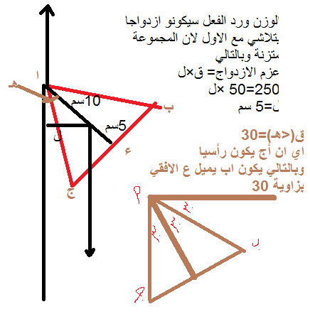 علقت الصفيحة فى مسمار افقى رفيع من ثقب صغير بالقرب من الراس ا بحيث كان مستواها راسيا اثر على الصفيحة ازدواج معيار عزمه يساوى 250 ثقل جرام واتجاهه عمودى على مستويها فاتزنت اوجد ميل اب على الافقى اذا علم ان ارتفاع المثلث يساوى 15 سم |