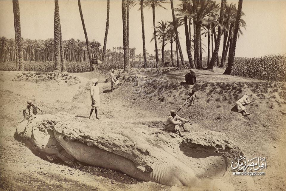 لقطة نادرة لتمثال رمسيس الثاني في مكان اكتشافة بمدينة ممفيس ( ميت رهينه ) - البدرشين التقطت في ستينات القرن ال 19 ( في الفترة 1860-1869 م )