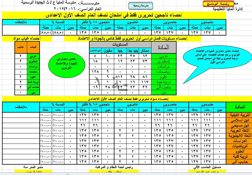 اخى الفاضل شكرا لرسالتك 1- يمكنك ترتيب الاسماء فى صفحة اكسيل خارجية ثم نسخها داخل البرنام. 2- يتم كتابة جدول الامتحان الأول فقط و تظهر باقى الجداول . 3- القرار الوزارى 313 لسنة 2011 لم ينص على ما ذكرت بالاغ ولى الامر بالتحريرى فقط . 4- الدور الثانى يتحدد من خلال تقدير دون المستوى . 5- حماية البرنامج مسئولية مصمم البرنامج . 6- يتم فتح برنامج واحد فقط ثم الحفظ و فتح أخر للحفاظ على سرعة اداء البرنامج . و اخيرا شكرا على جميع ملاحظاتك و اعانك الله وفقك فى حياتك المهنية و العملية أخوك احمد السيد