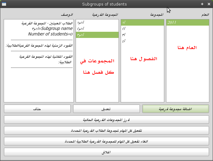 طبعا أخى الحبيب أنت تعلم أننا فى المرحلة الثانوية العامة هناك مواد إختارية وبالتالى يمكن تقسيم الفصل إلى عدة مجموعات ويدرس لكل مجموعة مدرس خاص بها فى ذات الحصة ( نظام التشعيب) فهل هذا متوفر فى هذا البرنامج