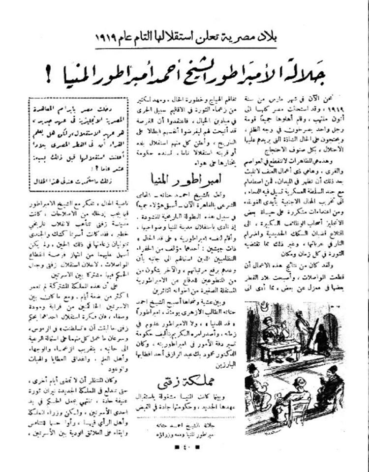 مدن مصرية تعلن استقلالها أثناء ثورة سنة 1919 ! الشيخ أحمد حتاتة ينصب نفسه امبراطورا في المنيا " امبراطورية علي أد الحال " و يؤلف جيشين أحدهما مكون من الخفراء النظاميين بعد أن استمالهم و وعدهم بزيادة رواتبهم و الآخر يتكون من اخوانه المتطوعين الثائرين للدفاع عن امبراطورية المنيا المستقلة . و قد أصدر الشيخ أحمد اوامره بتشكيل حكومة تدير شئون الامبراطورية المستقلة تولي رئاستها الدكتور محمود بك عبد الرازق . و في مدينة زفتي أعلنت عائلتي كشك و الجندي قيام الجمهورية و اسمياها " جمهورية زفتي " و اتفق الطرفين علي الحكم المشترك بين العائلتين . الخبر من مجلة كل شئ و الدنيا - مارس سنة 1919 . ![]()