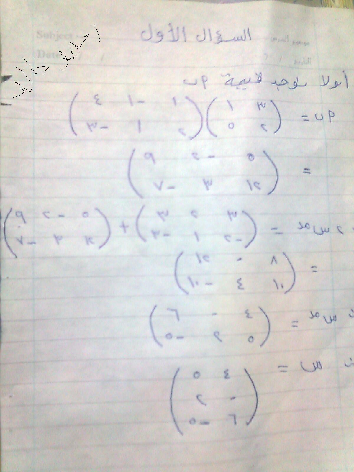 بس انا راجعتها لاقيتها برضو ذى ما هى دى خطوات الحل اب= (5 -2 9) (12 3 -7) 2س مدور = ( 3 2 3 ) + (5 -2 9) (-2 1 -3 ) (12 3 -7) =(8 0 12) (10 4 -10) بيالقسمه على 2 س مدور = (4 0 6 ) (5 4 -5 ) اذن س= (4 5) (0 4) (6 -5) ايه الغلط انا مش عارفه ![]() [/QUOTE]اسف الحل بتاعك صح اجابة موفقة وكده انتى و احمد عندكم نقطة واحدة احنا هنشتغل على نظام النقط اوكى يلا اللى عنده اى اسئلة بقى يكتبها لنا |
