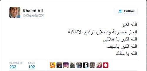 وستكون المحكمة الإدارية العليا هى صاحبة الحق فى الفصل فى القضية.. ولو لا قدر الله حكمت بتبعية الجزيرتين لمصر مرة أخرى سوف تذهب المملكة العربية السعودية إلى المحكمة الدولية وابقى اعمل مظاهرات وصرخ فى الفضائيات يا عزيزى المناضل.. وابقى اعرف إلى أى مدى أفدت مصر وخدمت الوطن.. مصر أكبر من أن تستولى على أملاك الغير بالبلطجة أو خضوعاً للمظاهرات والصراخ.. والرئيس أكثر وطنية من المناضل والمرشح السابق. ولنا لقاء قريب.