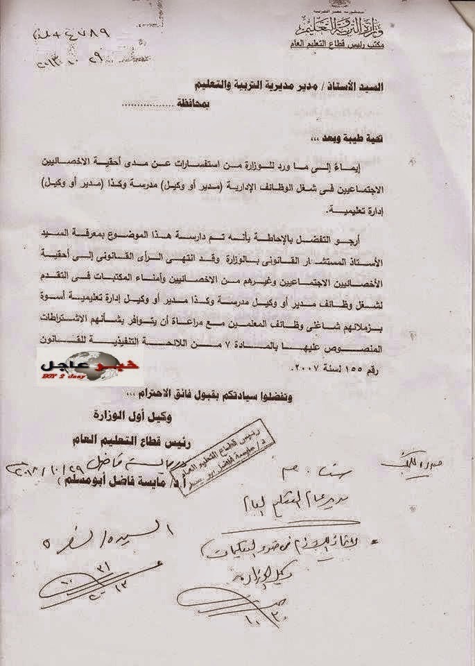 هذه صورة فاكس من الوزارة بتاريخ 29/10/2013 بخصوص احقية الاخصائيين في شغل الوظائف الادارية