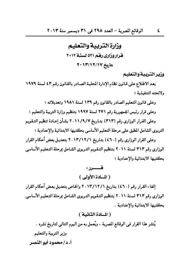 مرفق لسيادتكم القرار الوزارى رقم 460 الذى نص على حصول الطالب على 30% من مجموع درجتى العملى مع التحريرى ومرفق ايضا القرار رقم 521 الذى نص على الغاء العمل بالقرار 460 والرجوع للعمل بجميع مواد القرار 313
