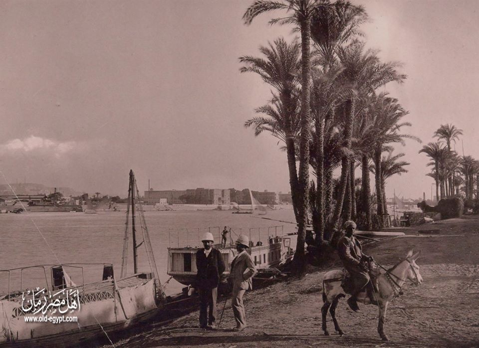 صورة من علي شاطئ النيل أمام فندق الماريوت بالزمالك سنة 1895 .