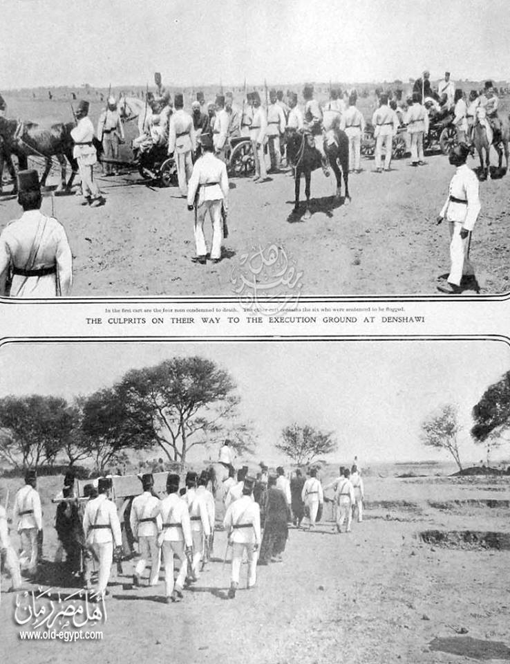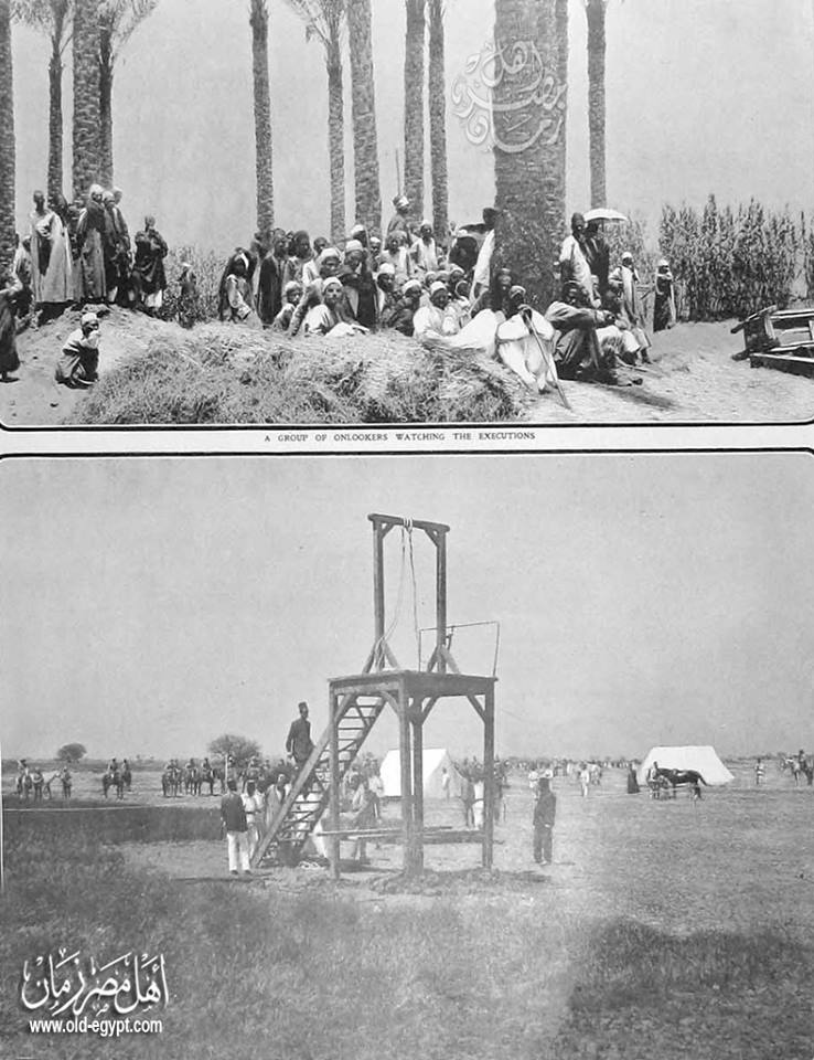 فلاحي دنشواي يساقون الي المشانق و في الصورة التالية الجرن الذي اندلعت بيه النيران في بداية القصة