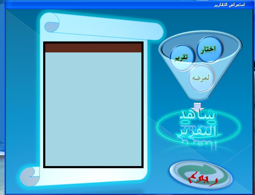 المشكلة ظهرت فى البرنامج عند الضغط على استعراض التقارير فلا يوجد قائمة للاختيار منها وزر الخروج ايضا غير مفعل والصورة فى المرفقات
