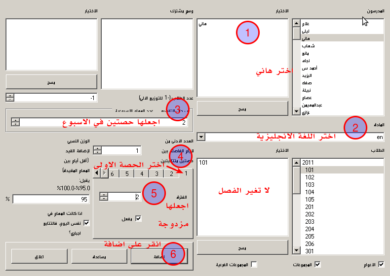 ملاحظة مهمة : من الاسهل ادخال البيانات : - في المرحلة الاعلى من الابتدائية : حسب مهام المدرس ، بمعنى ادخال جميع حصص المدرس "علام" ، ثم جميع حصص المدرسة "ليلى" وهكذا. ويظهر اثر هذه الطريقة (من ناحية السهولة) بشكل واضح في المراحل الدراسية الاعلى من الابتدائية ، ﻻن حصصها اكبر من حصتين في الاسبوع. - في المرحلة الابتدائية : حسب المادة.